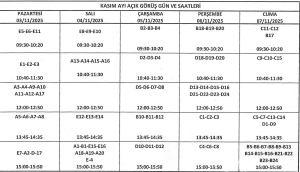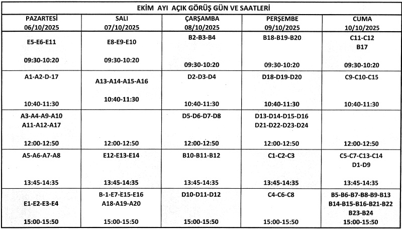 - Aylık açık görüşler her ayın ilk (Pazartesi ile başlayıp Cuma günü ile biten) tam haftasında açık görüş listesine göre yapılacaktır. (kapalı görüş günü ile farklı olabilir)